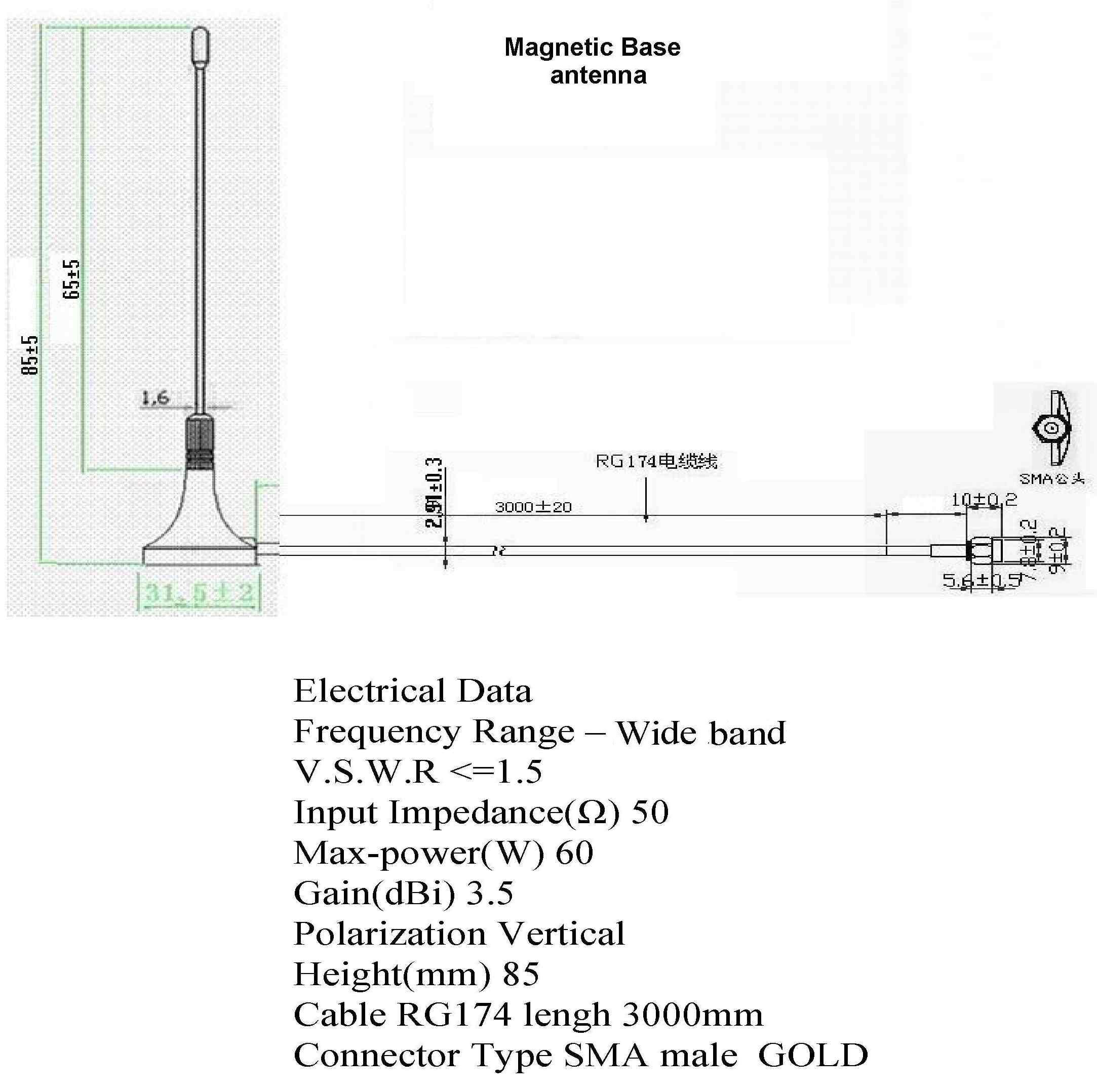 Short description: Active GPS antenna with magnetic base.Central frequency 1590 ± 3 Mhz.Gain 32 dB.Power DC 3-5V. RG174U cable, length-3m. SMA(m) connector.49.2 x 39.2 x 14.0mm.