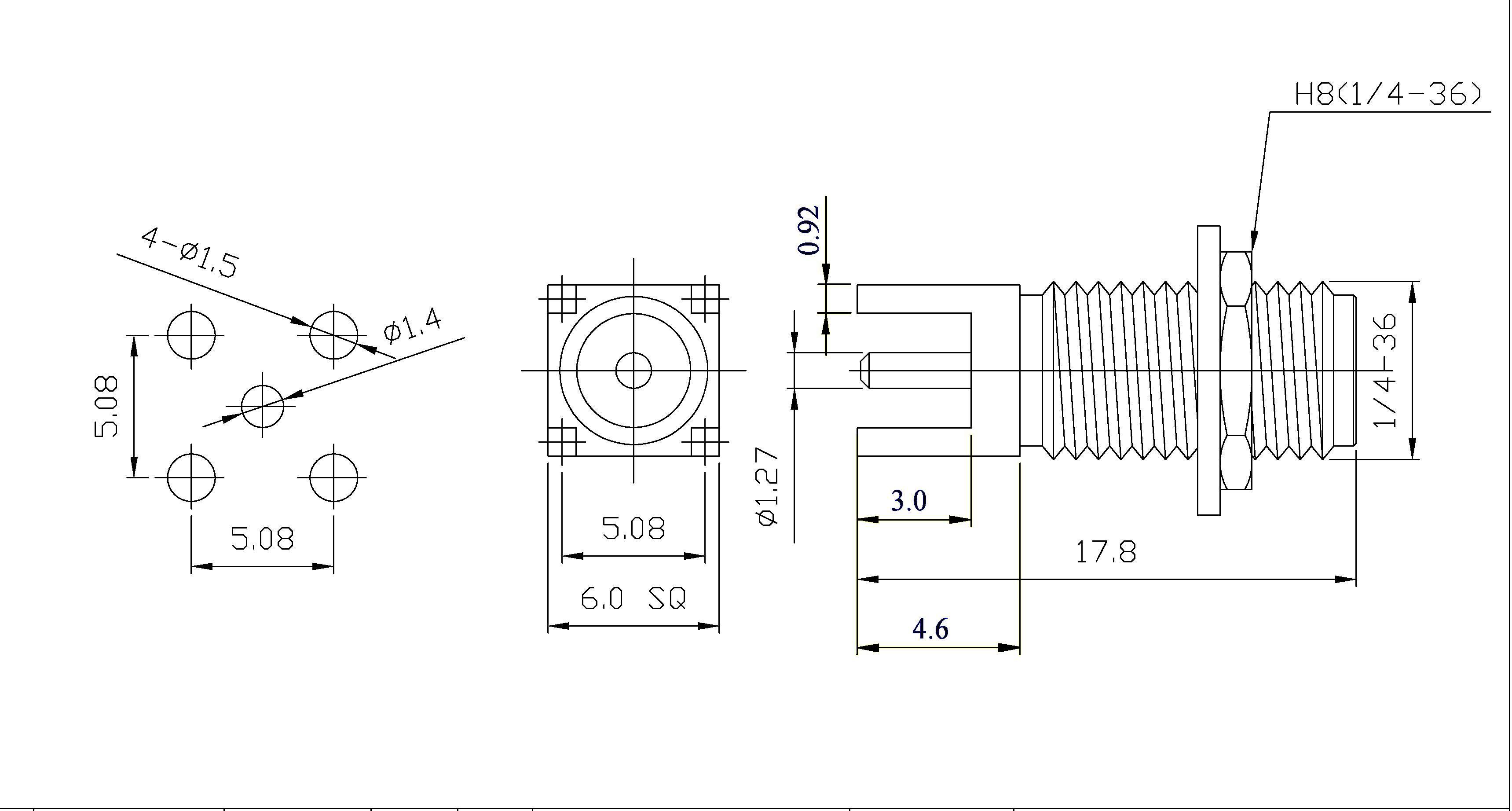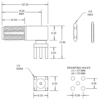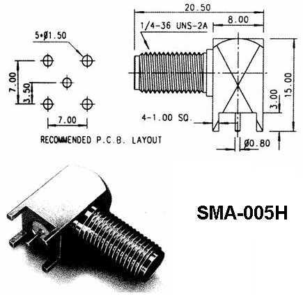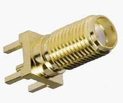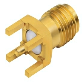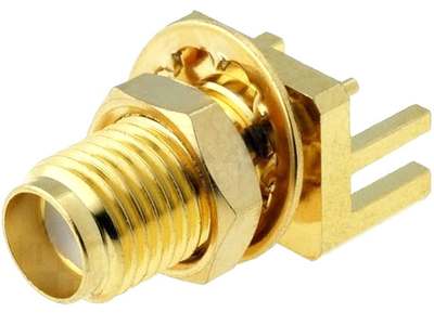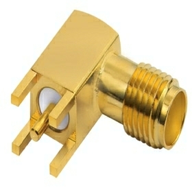 SMA(f) angle connector, with enlarged threaded portion for mounting on a printed circuit board footprint 5x5mm.