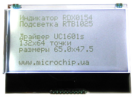 Graphic COG LCD 132x64 pixels. Driver - UC1601s. Size 65.0х47.5mm. Visible area 62.0х32.0mm. Recommended LED backlighting of RTB01025, TB1025S