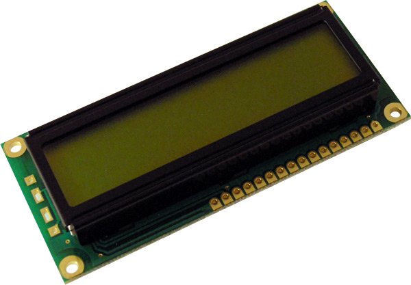 Short description: LCD analog AC162E, dimensions 122.0х44.0х13.6, 2 lines of 16 characters, character size 8.06х4.84, STN yellow-green, reflection-lumen 12 hours, yellow-green LED 5В backlight, extended temperature range