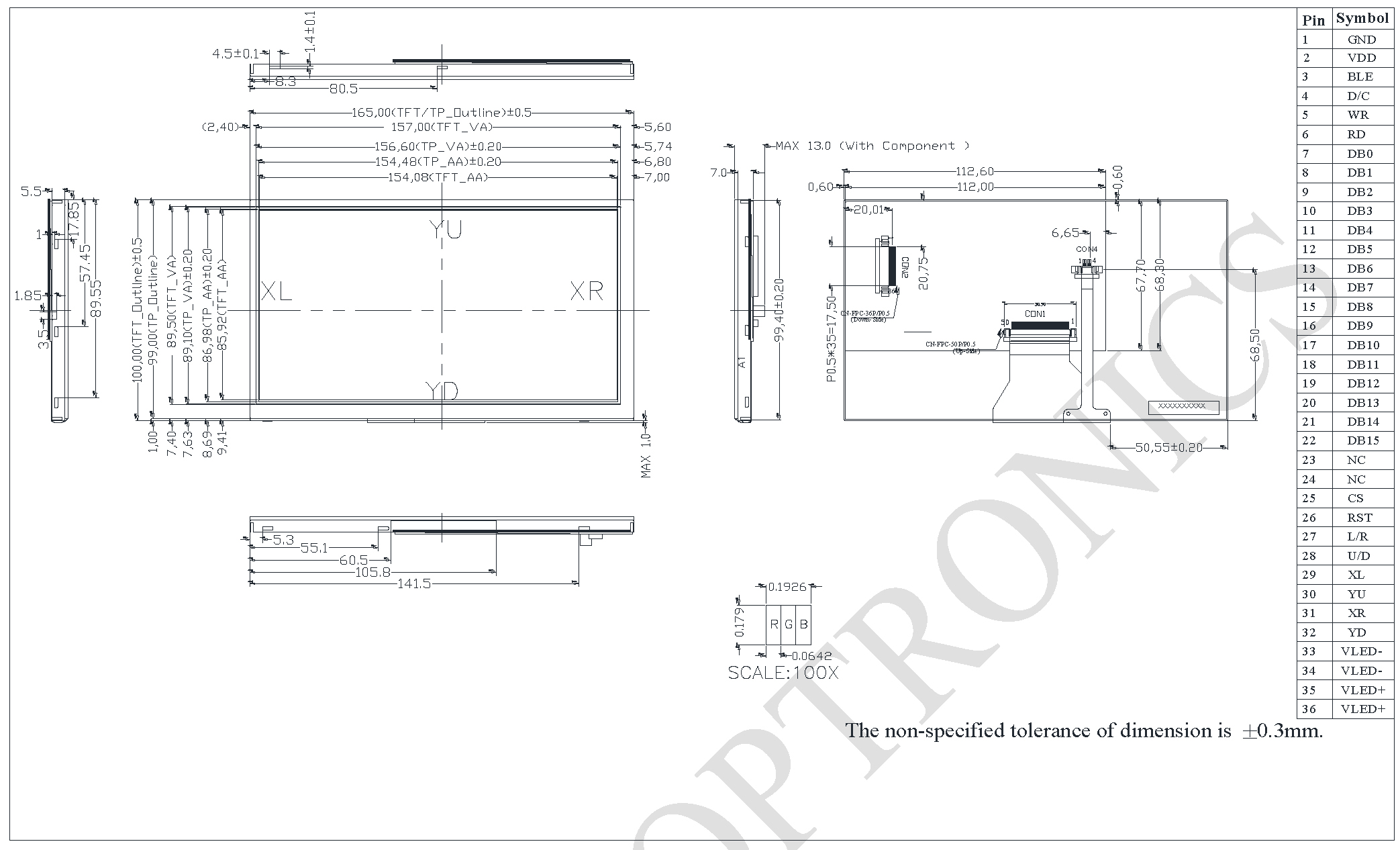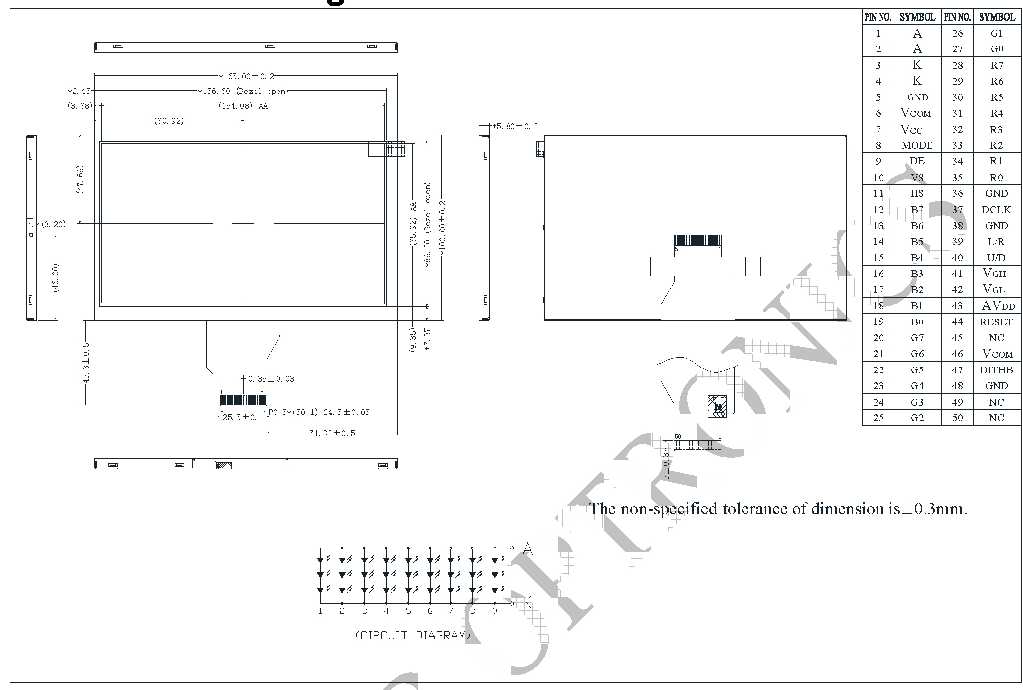 color graphic TFT display 7.0”,capacitive touch-panel, нтерфейс RGB, visible area 154.08 x 85.92 mm